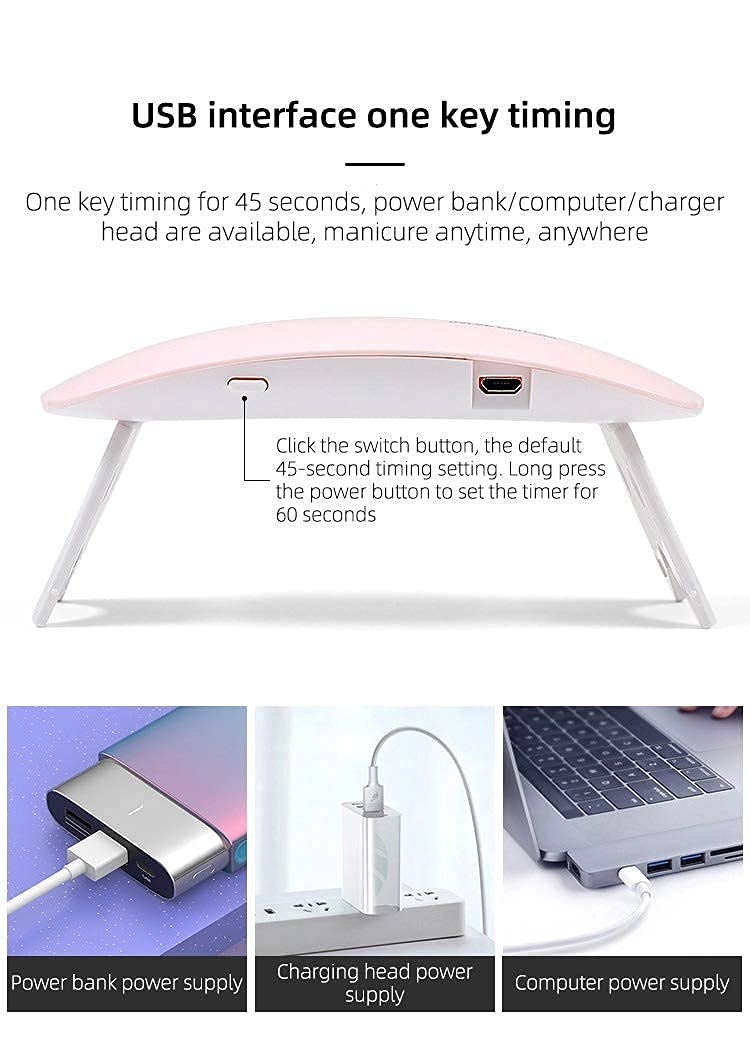 - 4-♥ EASY TO USE : Gently press the button then it will dry the nail polish, there are two timing functions inside, short press is work for curing 45 seconds, long press is work for curing 60 seconds, the time up will automatically go out.; ♥ LIGHT WEIGHT AND PORTABLE : Pocket size with micro USB port and USB line make it ideal for constant travels. USB cable is long enough for you with length of 1 Meter.