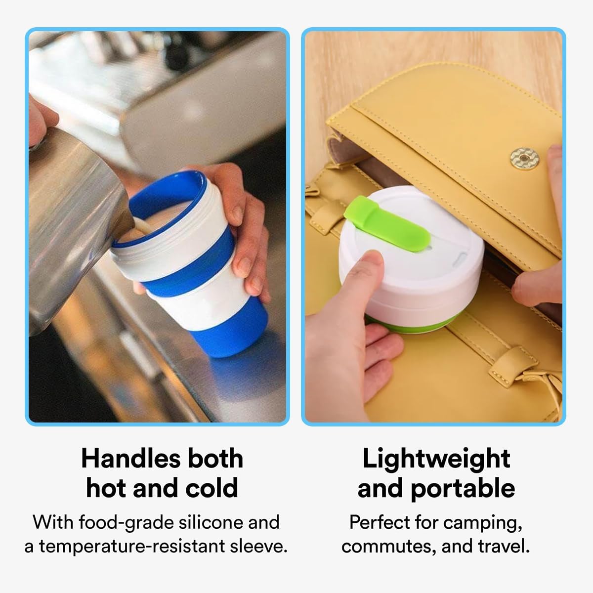 - ✡ Safety and Health -- The collapsible travel cup made of food grades silicone, rim and plastic lid, BPA Free, FDA Approved. Easy to clean, non-toxic, odorless, non-staining, durable, flexible & reusable.