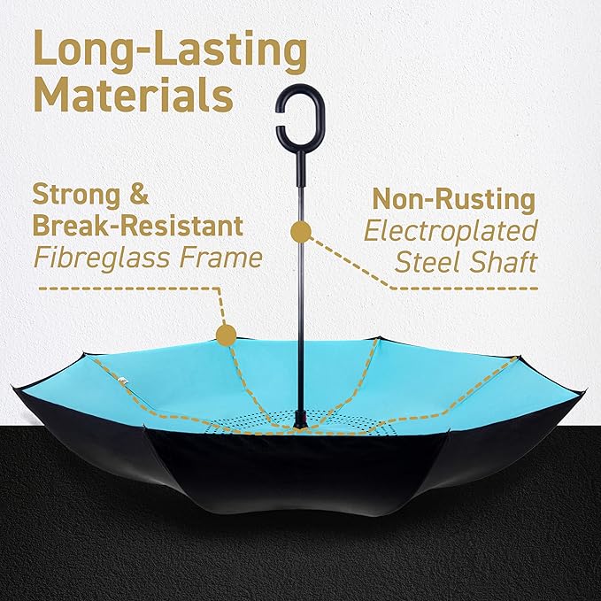 - stylish and sturdy, high quality, durable travel umbrella, High-end umbrella in the market. Sturdy and Windproof: Consist of high quality Fiberglass spokes, premium carbon fiber shaft and double layer pongee fabric. The waterproof effect is three times as common umbrella.