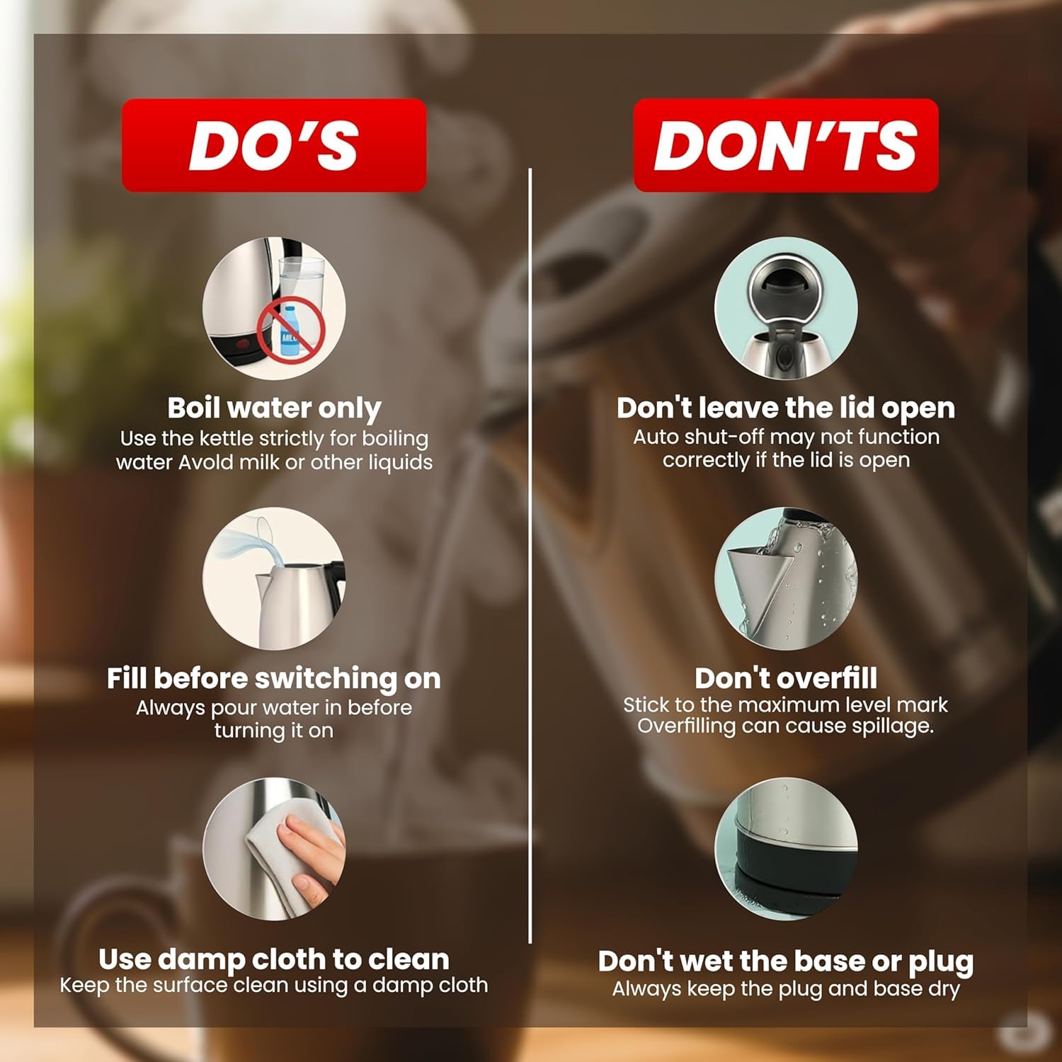 - Cordless Convenience: 360° rotatable cordless base and wide opening make pouring, filling, and cleaning easy and mess-free.