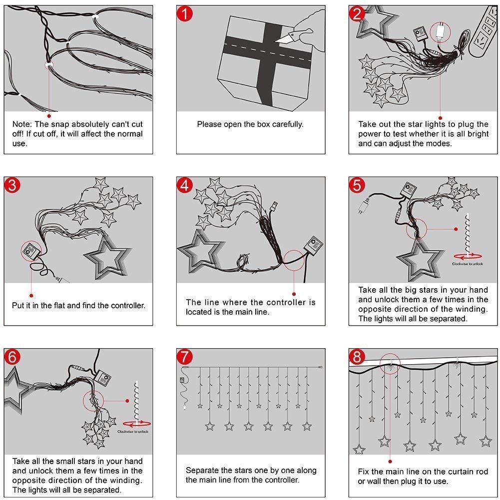 - ⭐ Easy to use : 12 Stars(2 sizes), total 138pcs LED curtain string lights, Low voltage and ul Listed power supply, directly plug in and unplug for power on and off