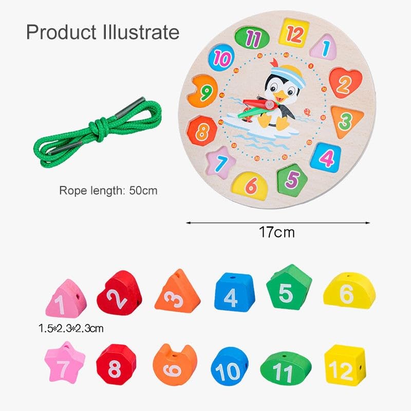 Wooden Learning Clock with Bead Lace, Educational Digital Analog Numbers, Shape & Color Learning Montessori Toy for Kids (Pack of 1, Multicolor)